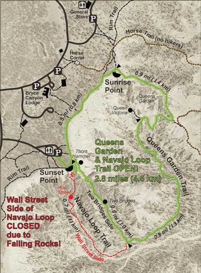 Der andere Abschnitt des Navajo Loop Trail, bekannt als Two Bridges, bleibt derweil geöffnet. Besucher sollten aber auch hier auf Steinschlag und rutschigen Untergrund achten. Wandern geschieht auf eigene Gefahr. Über Two Bridges kann man den 3 Meilen langen Queens Garden / Navajo Loop Combination Trail gehen.