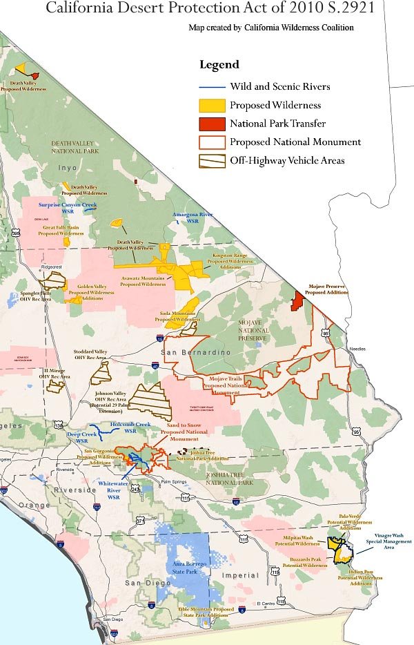 Außerdem würden Joshua Tree National Park und Death Valley National Park expandieren und zusätzliche Wilderness Gebiete im Death Valley eingerichtet.