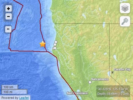 Ein Beben der Stärke 6,9 hat Nordkalifornien erschüttert. Es ereignete sich am Sonntag um 22:18:13 Uhr Ortszeit (Montag 05:18:13 MEZ) rund 80 Kilometer vor der Küste bei Eureka in einer Tiefe von 16,6 Kilometern. Damit befand sich das Epizentrum auf der Juan de Fuca Platte, die an dieser Stelle mit durchschnittlich 23 Millimetern pro Jahr unter die nordamerikanische Platte driftet.